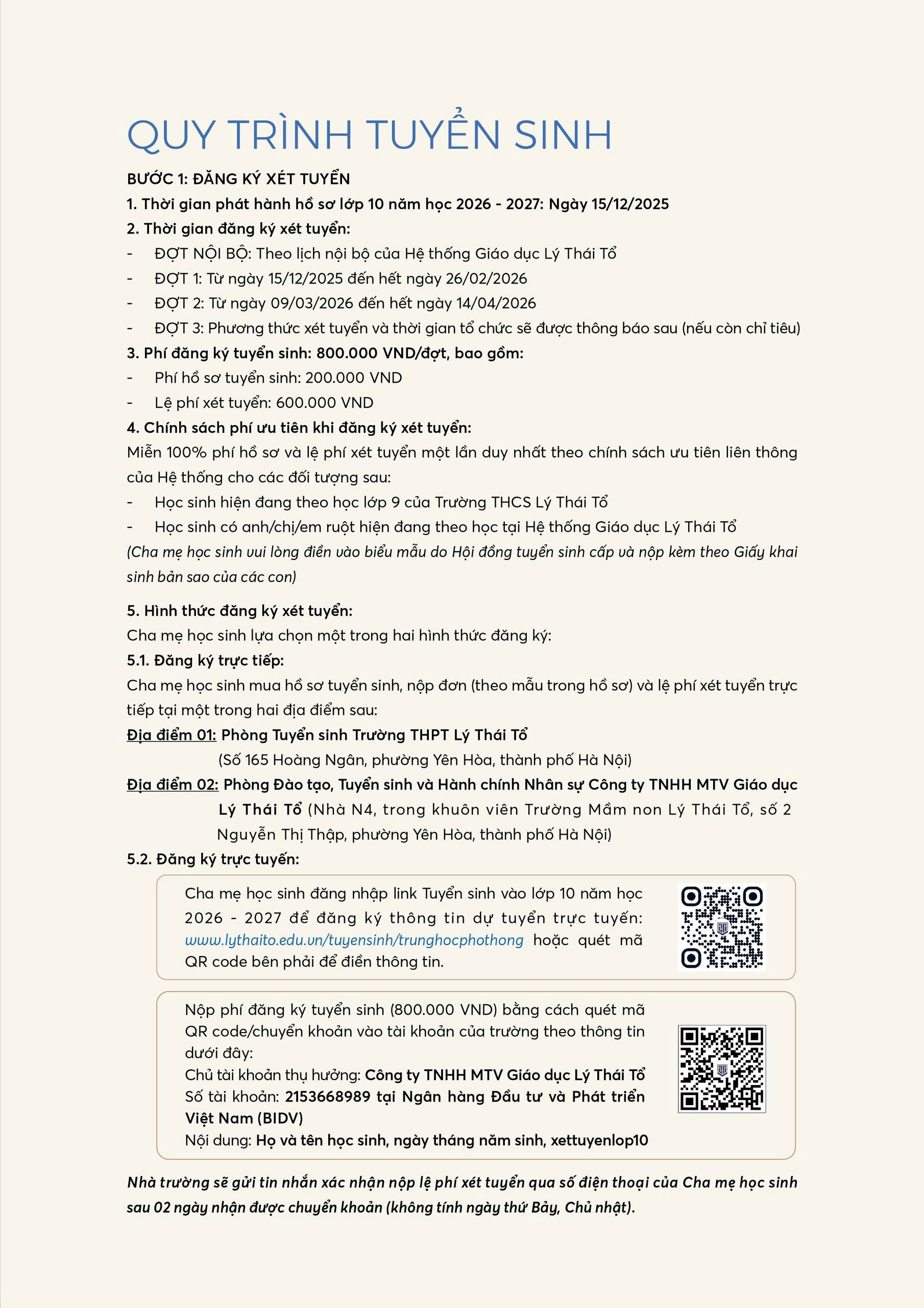 Để hiểu thêm thông tin xét tuyển vào lớp 10 năm học 2026 - 2027 Trường THPT Lý Thái Tổ, Quý cha mẹ học sinh vui lòng đọc các thông tin dưới đây: