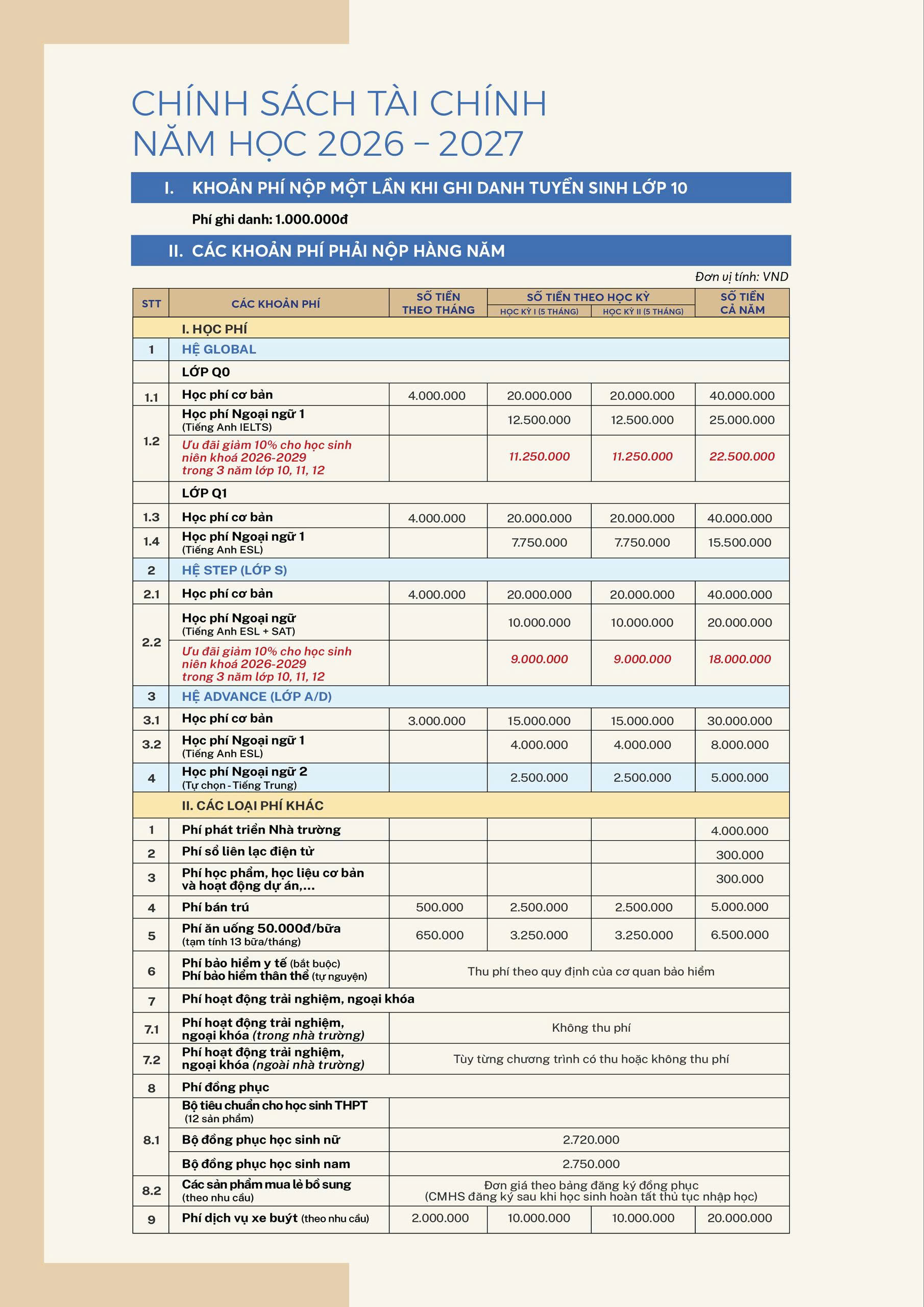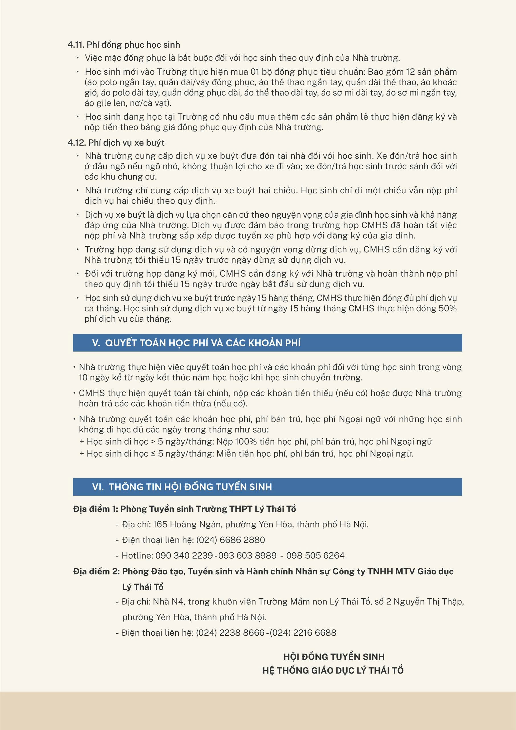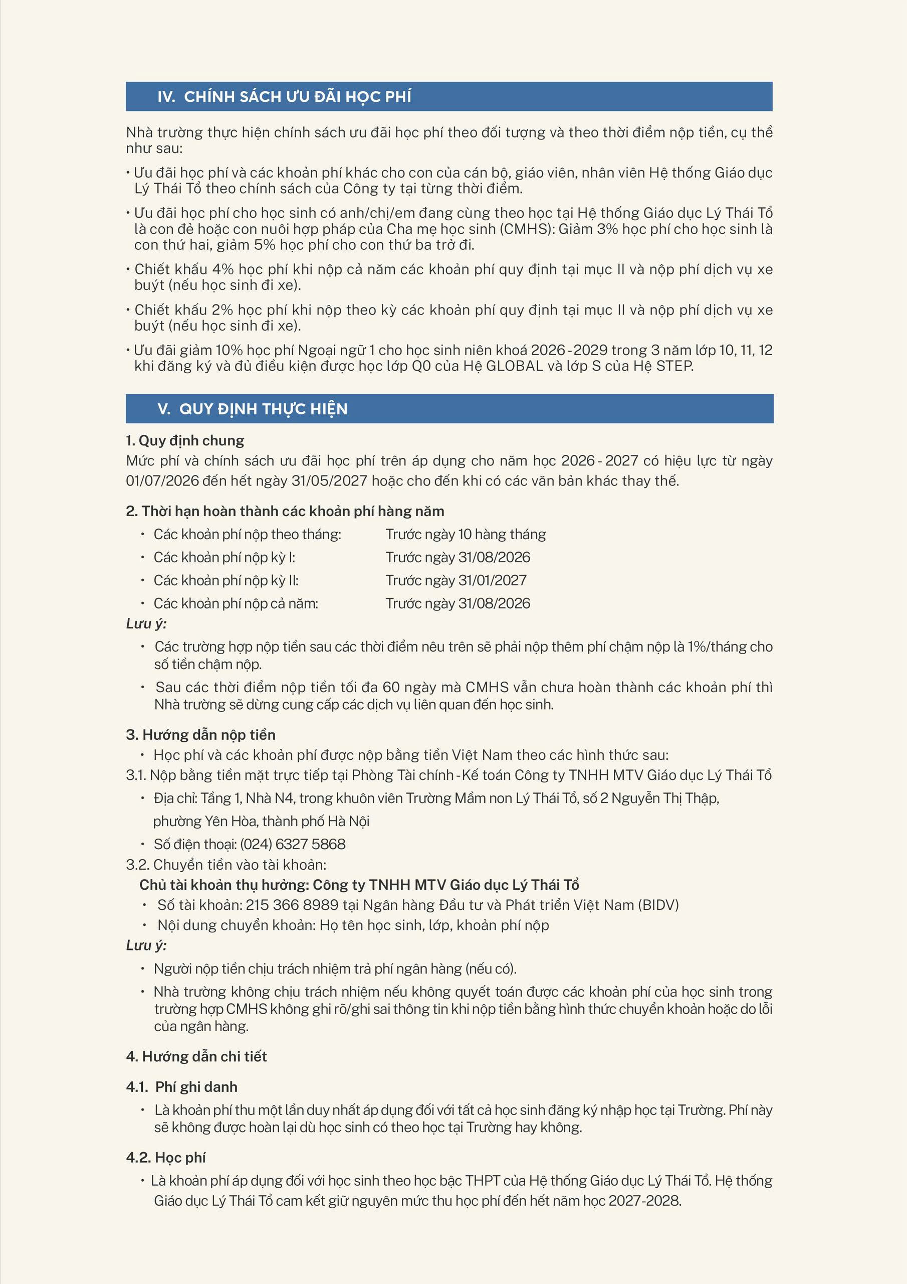 5. Ghi chú: Chính sách phí ưu tiên khi đăng ký xét tuyển: Miễn 100% phí hồ sơ và lệ phí xét tuyển một lần duy nhất theo chính sách ưu tiên liên thông của Hệ thống cho các đối tượng học sinh có anh/chị/em ruột hiện đang theo học tại Hệ thống Giáo dục Lý Thái Tổ. Để hưởng chính sách cha mẹ học sinh tải file, điền đầy đủ thông tin và làm theo hướng dẫn trong phiếu: Phiếu khai thông tin Anh/Chị/Em ruột đang học Hệ thống giáo dục Lý Thái Tổ