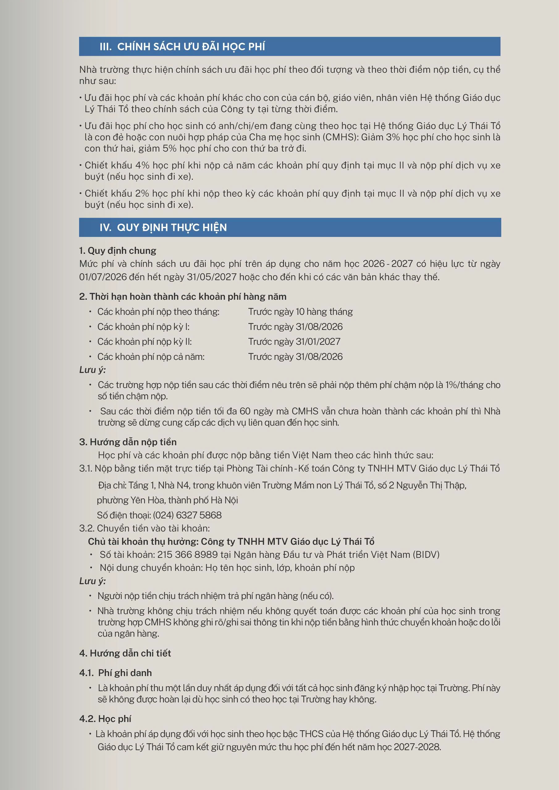 6. Ghi chú: Chính sách phí ưu tiên khi đăng ký xét tuyển: Miễn 100% phí hồ sơ và lệ phí xét tuyển một lần duy nhất theo chính sách ưu tiên liên thông của Hệ thống cho các đối tượng học sinh có anh/chị/em ruột hiện đang theo học tại Hệ thống Giáo dục Lý Thái Tổ. Để hưởng chính sách cha mẹ học sinh tải file, điền đầy đủ thông tin và làm theo hướng dẫn trong phiếu: Phiếu khai thông tin Anh/Chị/Em ruột đang học Hệ thống giáo dục Lý Thái Tổ