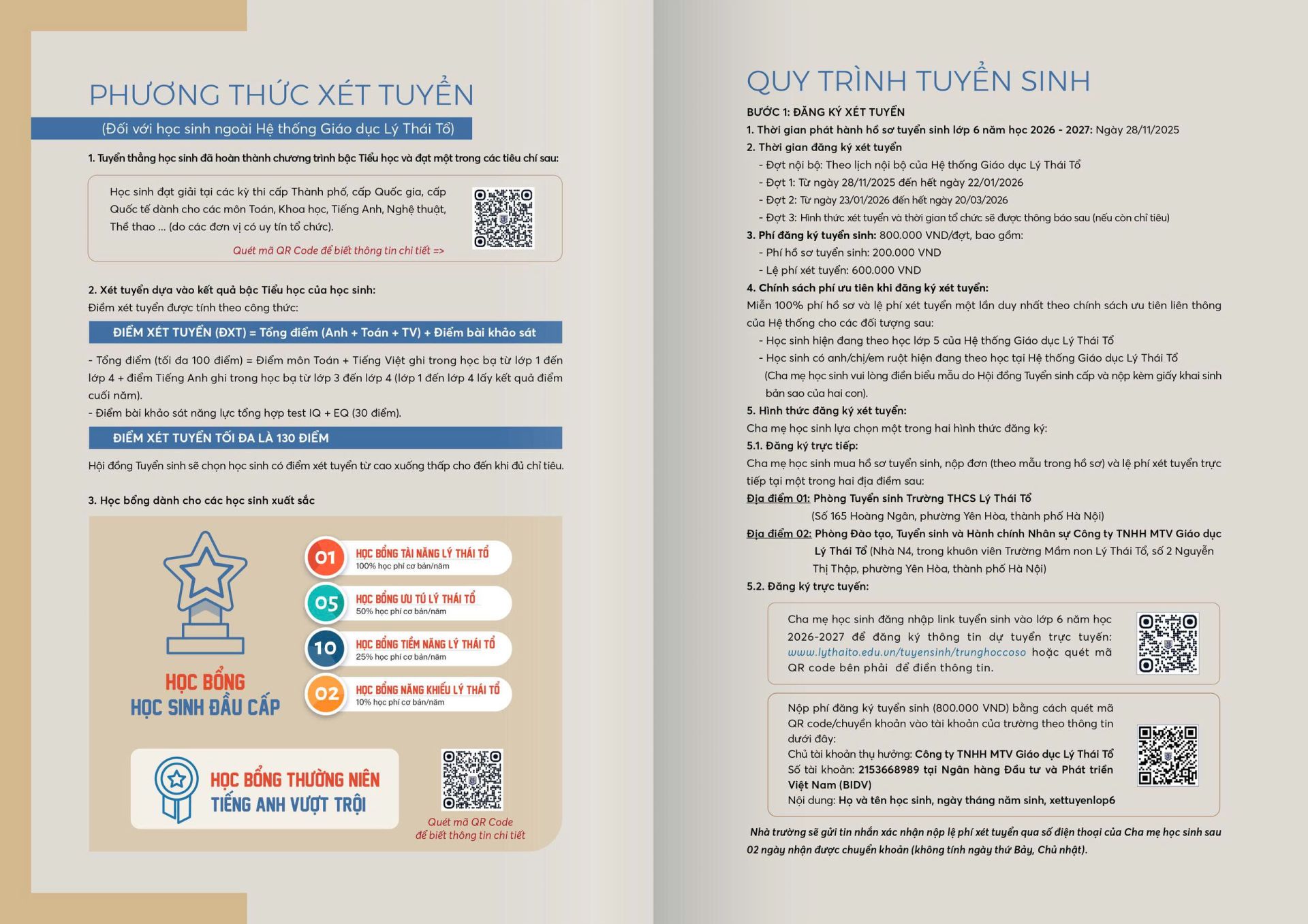 Để hiểu thêm thông tin xét tuyển vào lớp 6 năm học 2026 - 2027 Trường THCS Lý Thái Tổ, Quý cha mẹ học sinh vui lòng đọc các thông tin dưới đây: