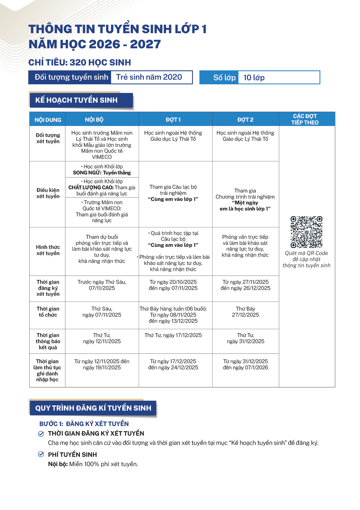 Trường Tiểu học Lý Thái Tổ trân trọng thông báo thông tin tuyển sinh vào lớp 1 năm học 2026-2027 như sau: