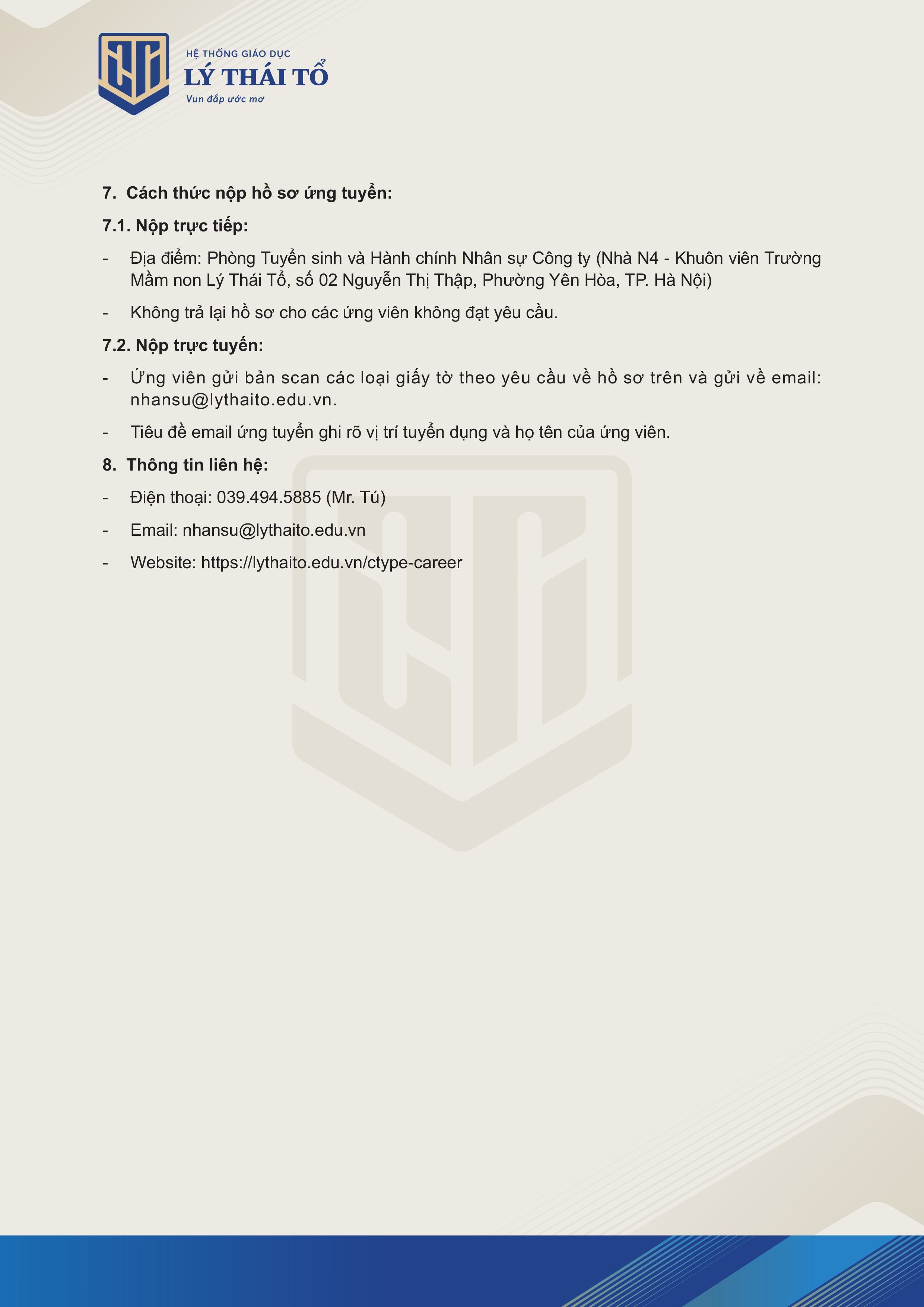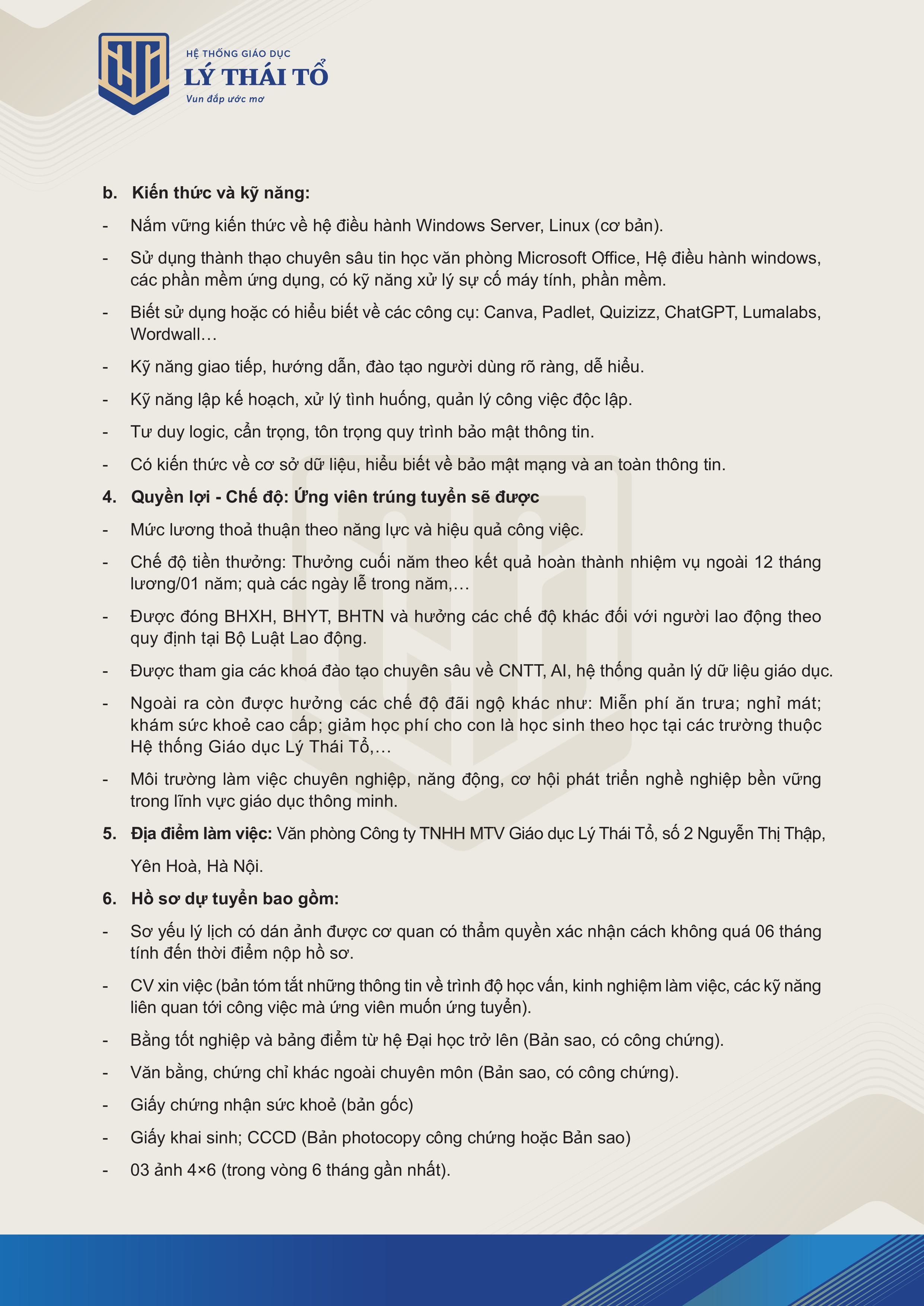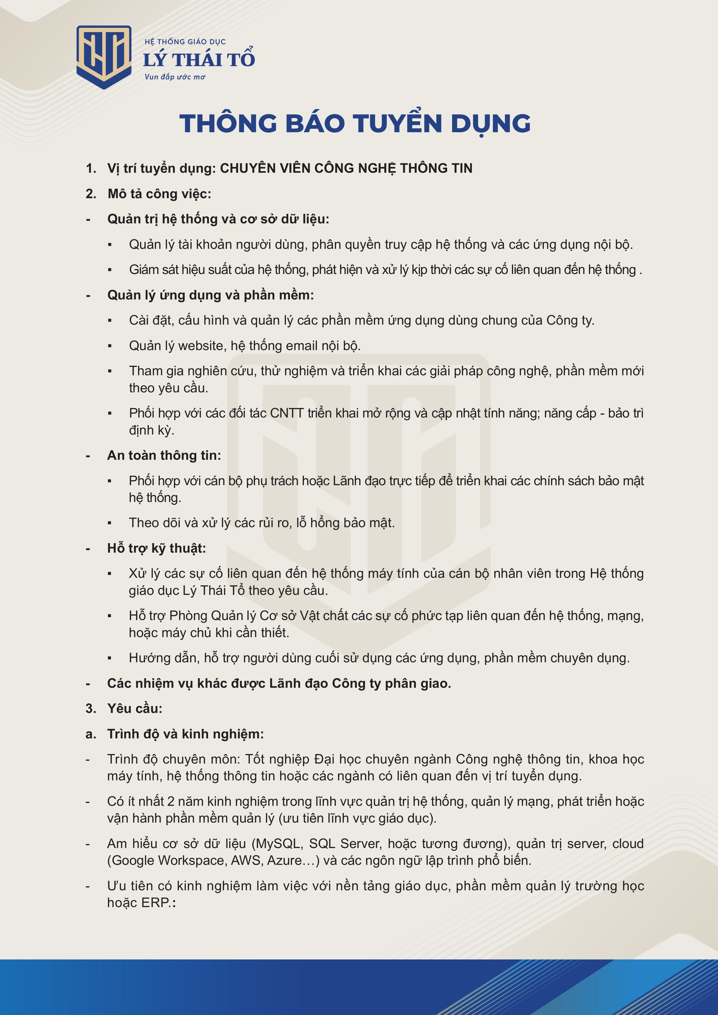 Hệ thống giáo dục Lý Thái Tổ thông báo tuyển dụng chuyên viên Công nghệ thông tin. Thông tin tuyển dụng cụ thể như sau: