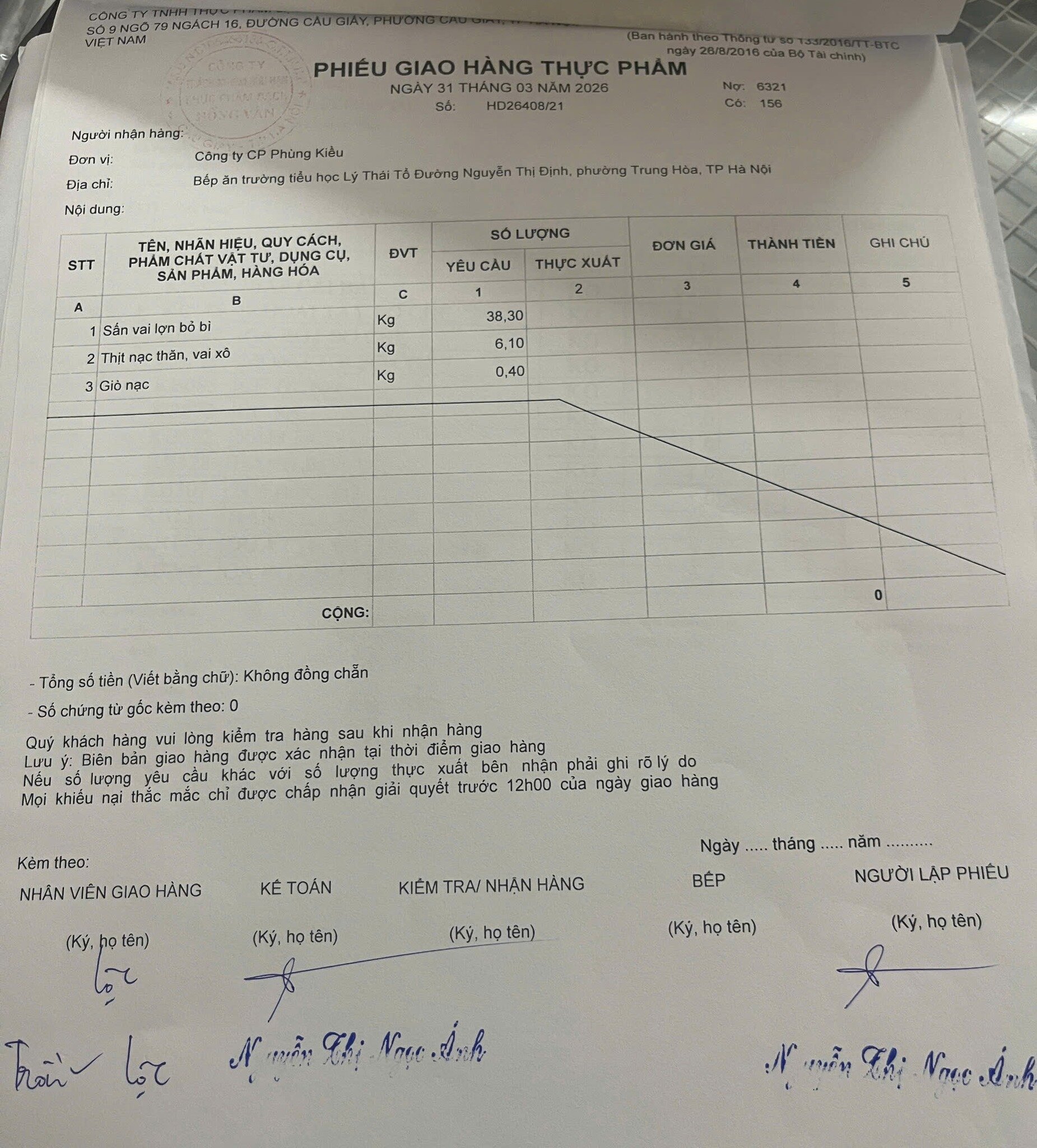 Phiếu giao hàng thực phẩm cho Bếp ăn của trường THCS-THPT Lý Thái Tổ ngày 31/3/2026