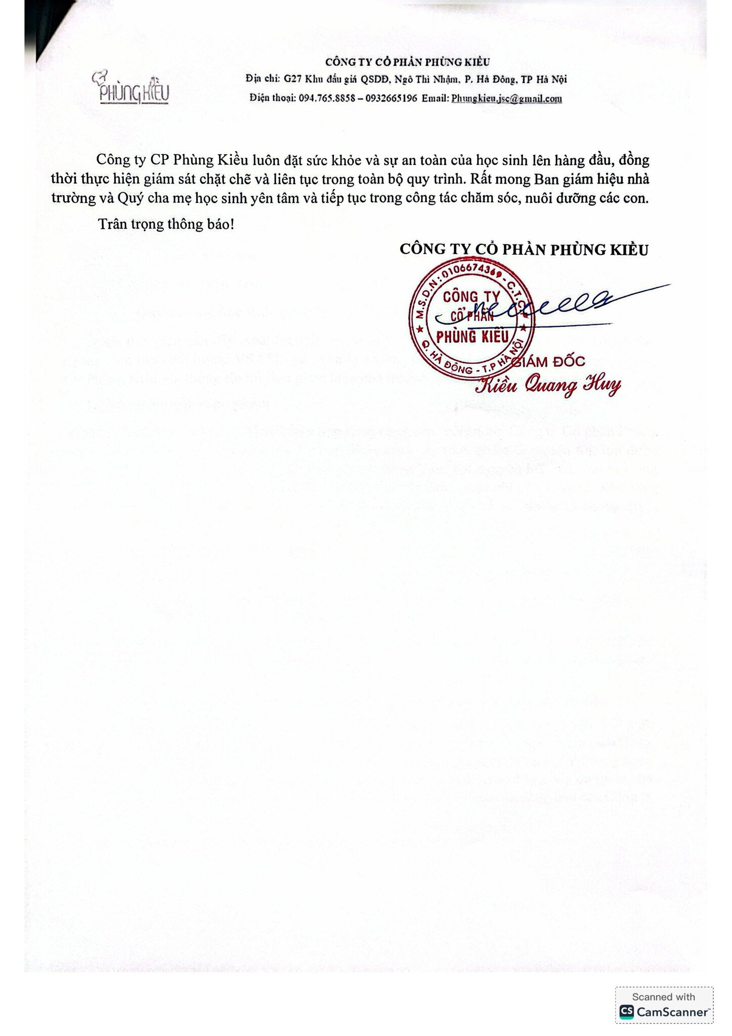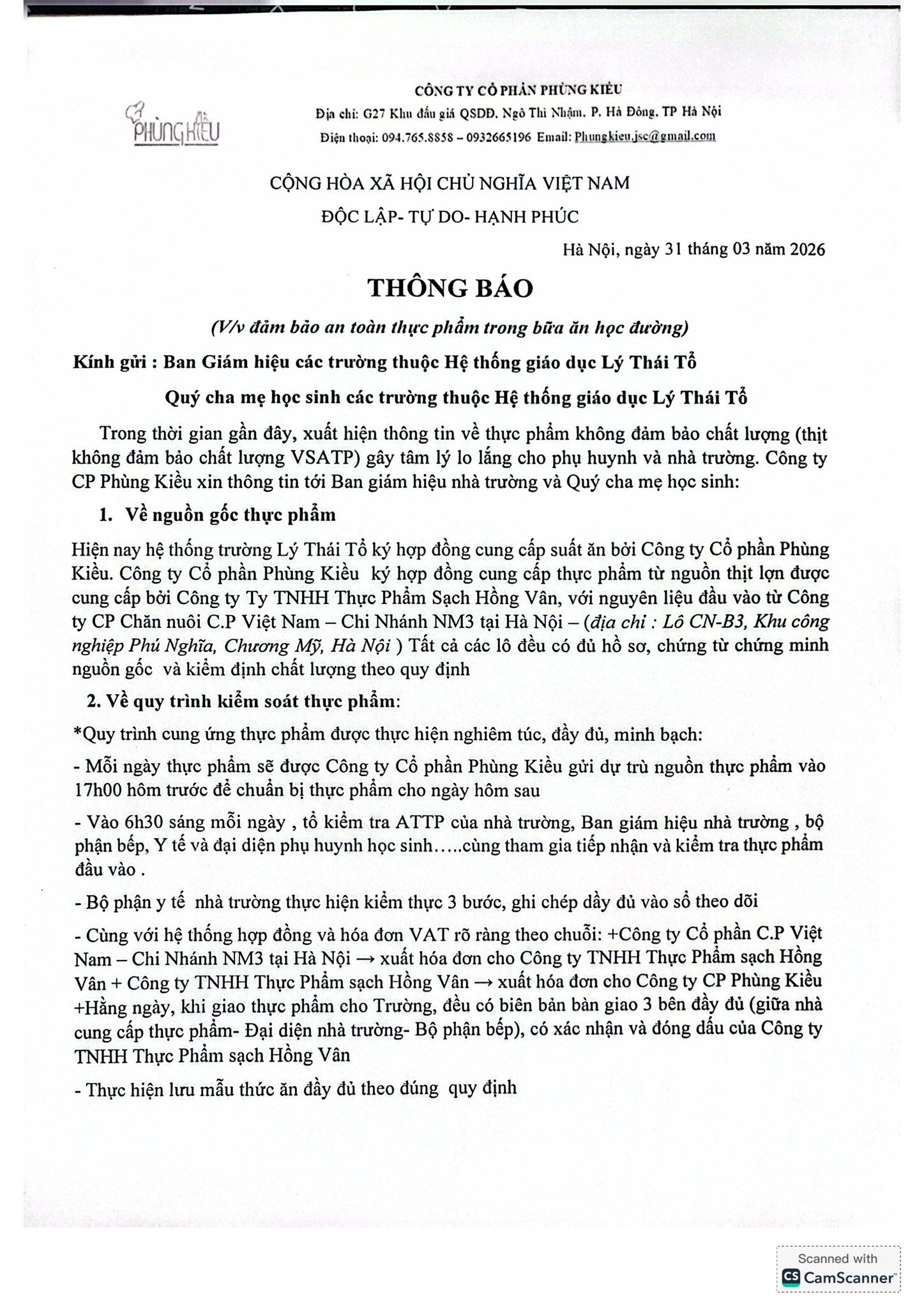 Thông báo mới nhất từ đối tác cung cấp suất ăn - Công ty CP Phùng Kiều gửi tới Hệ thống Lý Thái Tổ ngày 31/3/2026