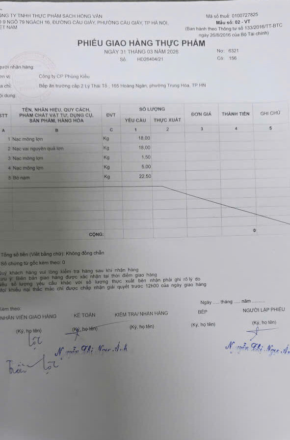 Phiếu giao hàng thực phẩm cho Bếp ăn của trường Tiểu học Lý Thái Tổ ngày 31/3/2026