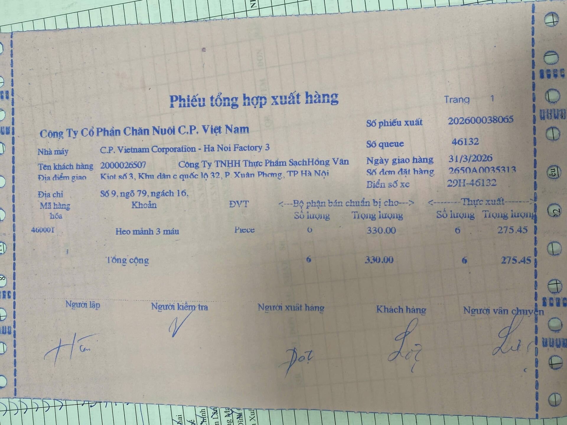 Phiếu tổng hợp xuất hàng của Công ty Cổ phần Chăn nuôi C.P Việt Nam cho Công ty TNHH Thực phẩm sạch Hồng Vân - đối tác của Công ty CP Phùng Kiều