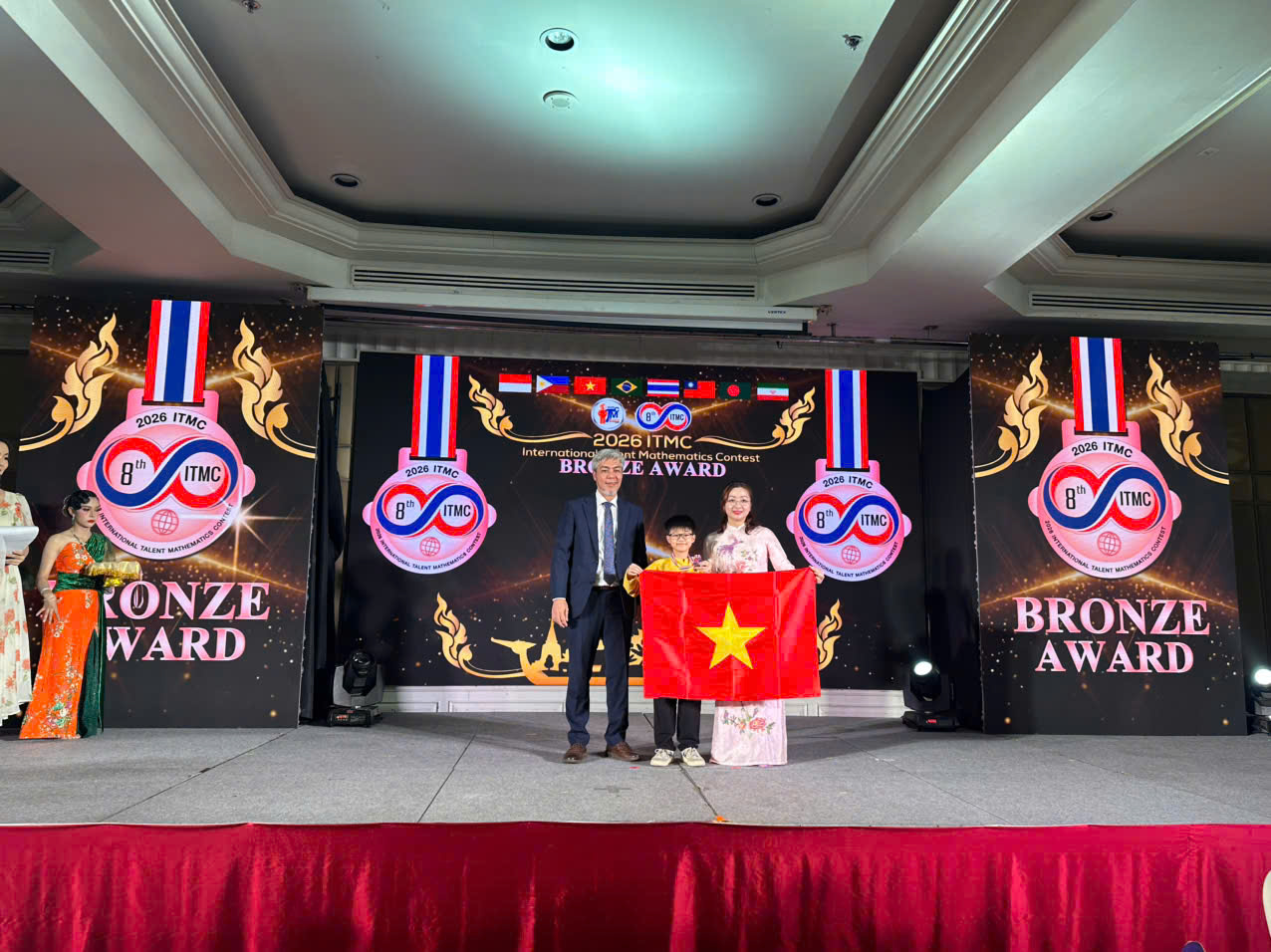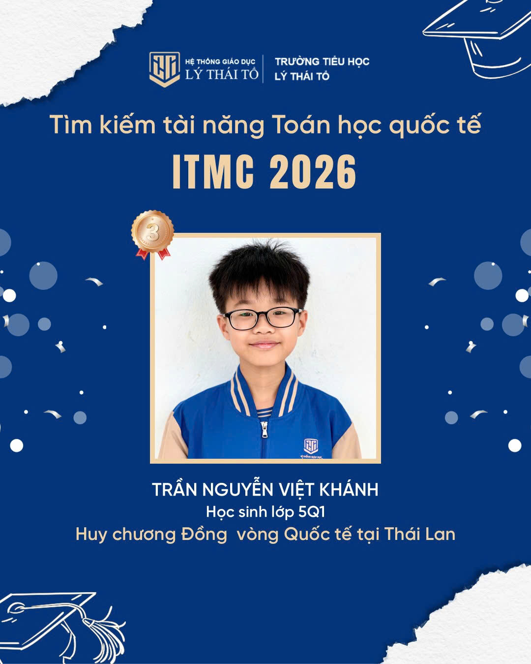Đặc biệt, em Trần Nguyễn Việt Khánh – lớp 5Q1 đã xuất sắc giành Huy chương Đồng tại vòng Chung kết “Tìm kiếm Tài năng Toán học Quốc tế – ITMC 2026” tổ chức tại Thái Lan. Thành tích của Việt Khánh đã góp phần vào bảng thành tích chung của Đoàn học sinh Việt Nam tại sân chơi Toán học uy tín do Tổ chức Giáo dục Thai Talent Training tổ chức.