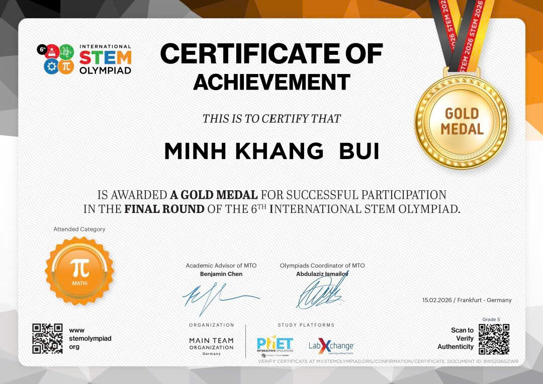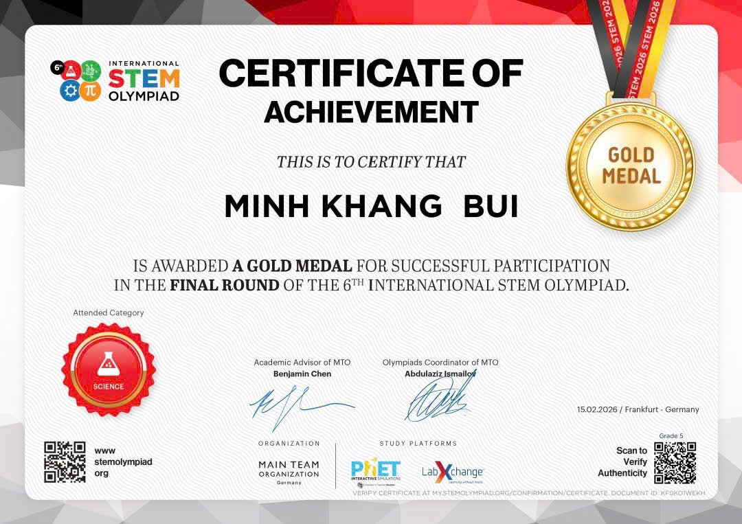 Giấy chứng nhận học sinh Bùi Minh Khang đạt Huy chương Vàng tại Vòng chung kết kỳ thi STEM quốc tế lần thứ 6
