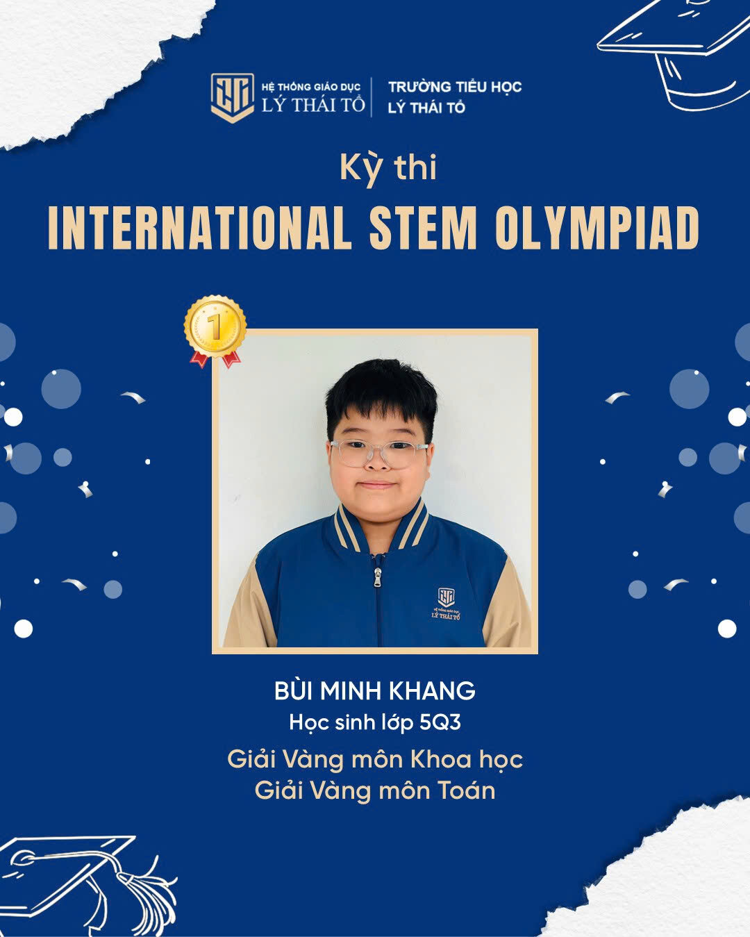 Trong đó, em Bùi Minh Khang – lớp 5Q3 đã chinh phục 02 Huy chương Vàng môn Toán và Khoa học tại International STEM Olympiad 2026 – một kỳ thi quốc tế dành cho học sinh từ lớp 1 đến lớp 12 với hệ thống câu hỏi được xây dựng theo định hướng giáo dục STEM hiện đại. Thành tích ấn tượng này cho thấy khả năng tư duy logic, niềm say mê khám phá khoa học và bản lĩnh hội nhập của học sinh Lý Thái Tổ.