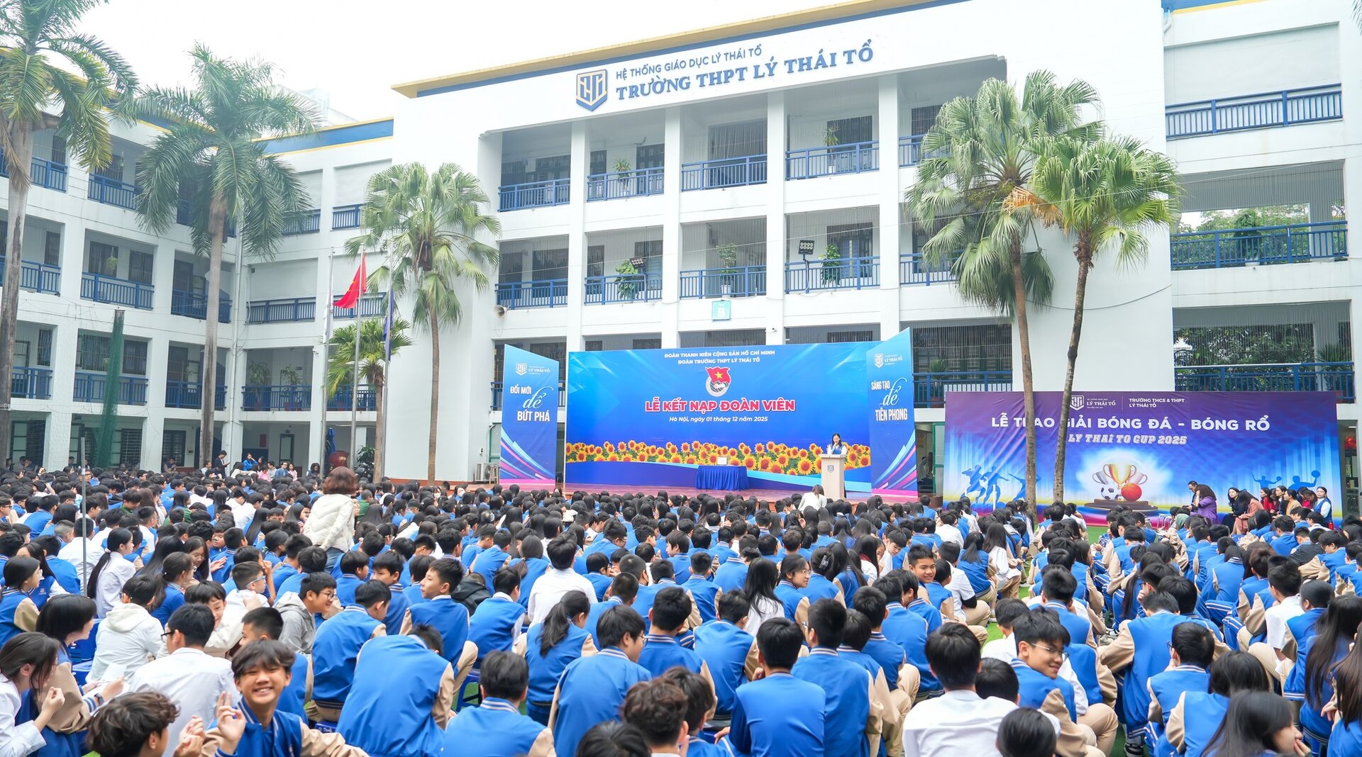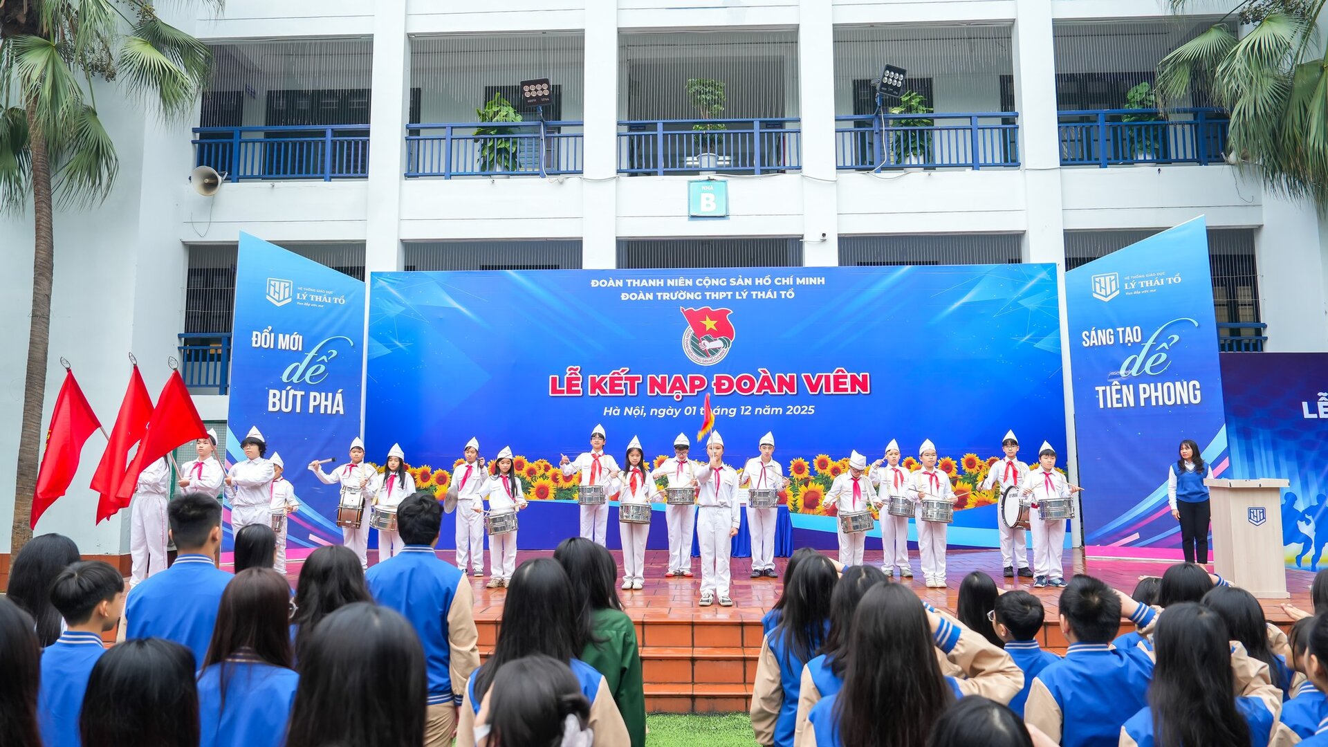 Sáng thứ Hai, ngày 01/12/2025, tại sân trường, Lễ kết nạp đoàn viên mới đã diễn ra trang trọng và thiêng liêng. Trong không khí rực rỡ sắc cờ và sắc áo xanh thanh niên, 194 học sinh đến từ các chi đoàn khối 10, 11 và 12 đã chính thức vinh dự đứng vào hàng ngũ Đoàn TNCS Hồ Chí Minh. Khoảnh khắc các em giơ cao nắm tay tuyên thệ, cất vang lời hứa phấn đấu, càng làm nổi bật tinh thần cống hiến, trách nhiệm và khát vọng sống đẹp của thế hệ trẻ Lý Thái Tổ.