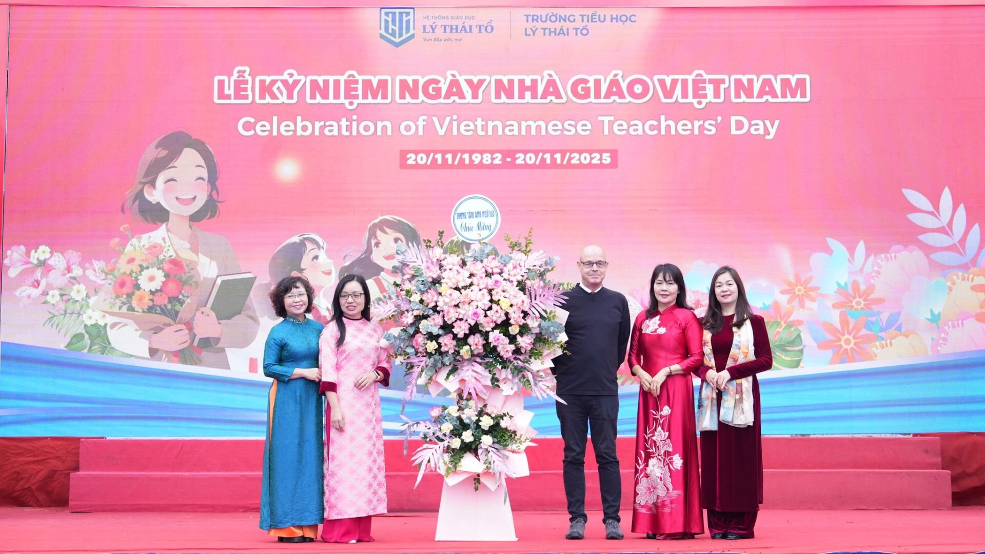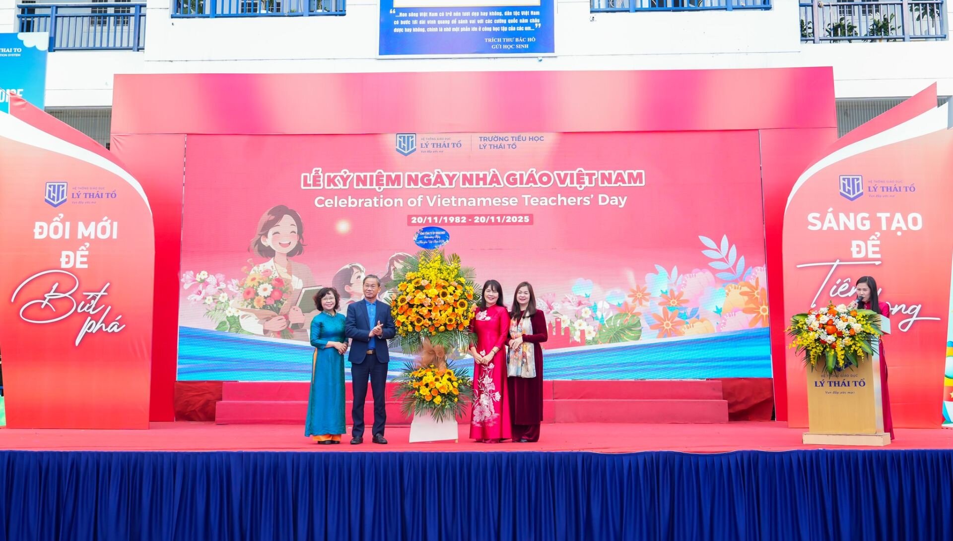 Ông Nguyễn Hữu Tới – Bí thư Đảng ủy, Chủ tịch HĐQT Tổng Công ty Vinaconex, Tổng Giám đốc Hệ thống Giáo dục Lý Thái Tổ và ông Nguyễn Mạnh Cường – Chủ tịch Công đoàn Tổng Công ty Vinaconex, đã dành tặng nhà trường những lẵng hoa tươi thắm và gửi lời tri ân sâu sắc đến đội ngũ thầy cô giáo, ghi nhận những nỗ lực bền bỉ và những đóng góp quan trọng của nhà trường trong hành trình đổi mới và nâng cao chất lượng giáo dục.