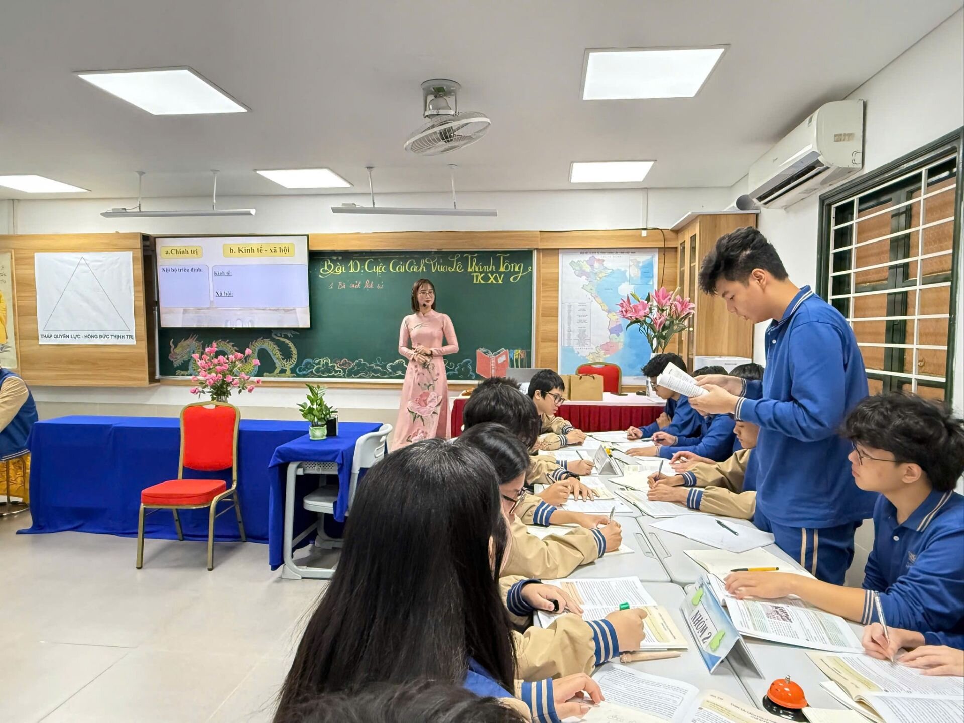 Mở đầu tiết học, trò chơi khởi động “Vua tiếng Việt” đã giúp các em học sinh khơi lại kiến thức cũ một cách sôi nổi và đầy hứng thú. Không dừng lại ở đó, cô giáo tiếp tục dẫn dắt học sinh bước vào hoạt động trọng tâm – “Phiên tòa lịch sử: Đại Việt có cần cải cách hay không?”. Ở “phiên tòa” này, học sinh được hóa thân thành các nhân vật lịch sử như vua Lê Thánh Tông, nông dân, quan lại, nho sĩ, cùng tranh luận, phản biện về bối cảnh đất nước Đại Việt thế kỷ XV. Cách tổ chức này không chỉ giúp học sinh hiểu sâu sắc về nội dung bài học, mà còn phát huy năng lực tư duy phản biện, kỹ năng thuyết trình và làm việc nhóm.
