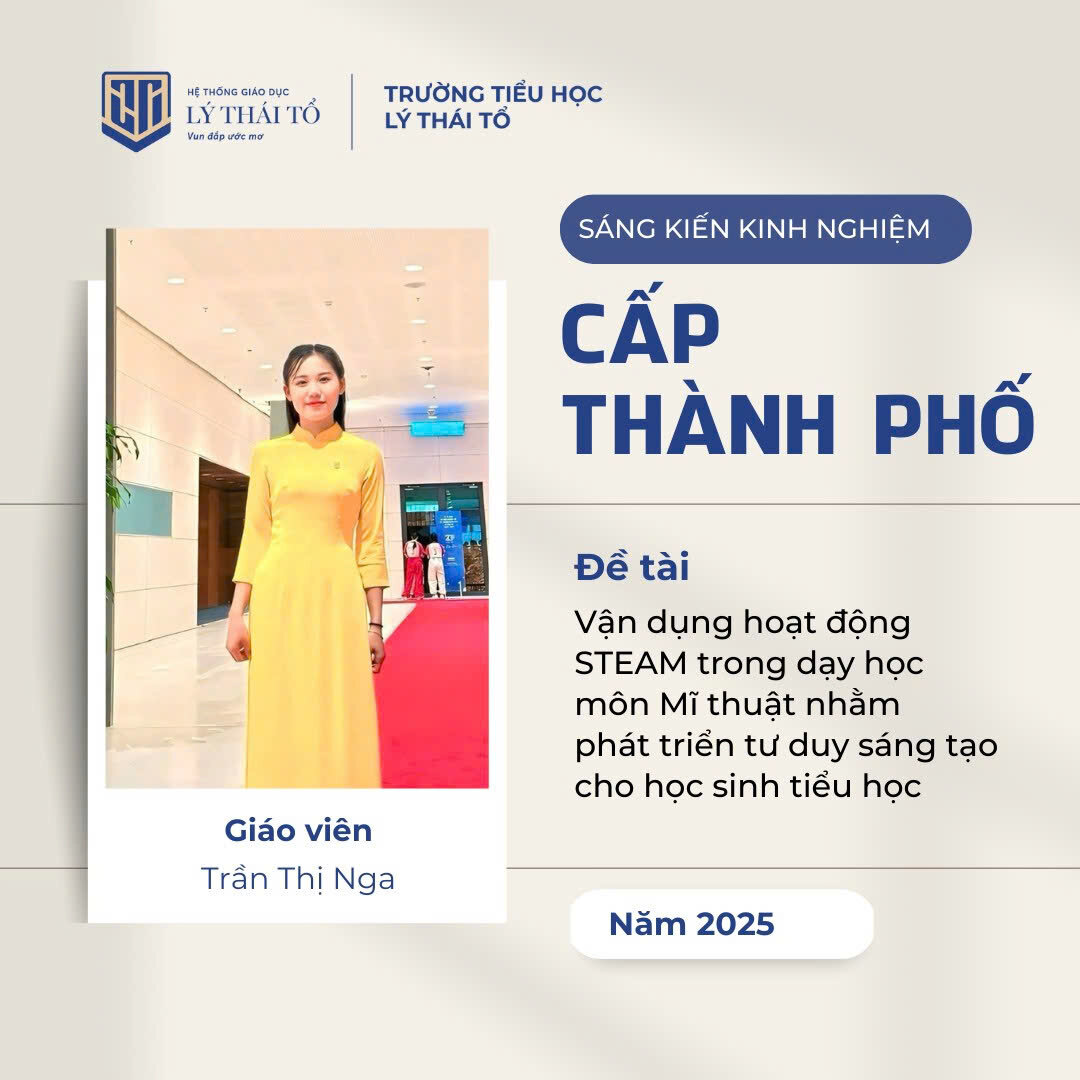 Ở mảng giảng dạy, các giáo viên đã đem đến những nghiên cứu gắn với thực tiễn lớp học. Cô Nguyễn Thị Mai (GVCN 2Q3) triển khai giải pháp làm giàu vốn từ cho học sinh lớp 2 thông qua môn Tiếng Việt, góp phần cải thiện kỹ năng đọc – viết – diễn đạt. Cô Trần Diệu Linh (GVCN 4Q5) thử nghiệm hiệu quả phương pháp Học thông qua chơi và dạy học tích cực trong môn Toán lớp 5, giúp học sinh hứng thú, chủ động và phát triển tư duy logic. Đặc biệt, cô Trần Thị Nga – Giáo viên Mỹ thuật đã mang STEAM vào giảng dạy qua sáng kiến vận dụng hoạt động STEAM trong môn Mỹ thuật nhằm phát triển tư duy sáng tạo cho học sinh tiểu học, mở ra hướng tiếp cận nghệ thuật hiện đại, đa chiều.