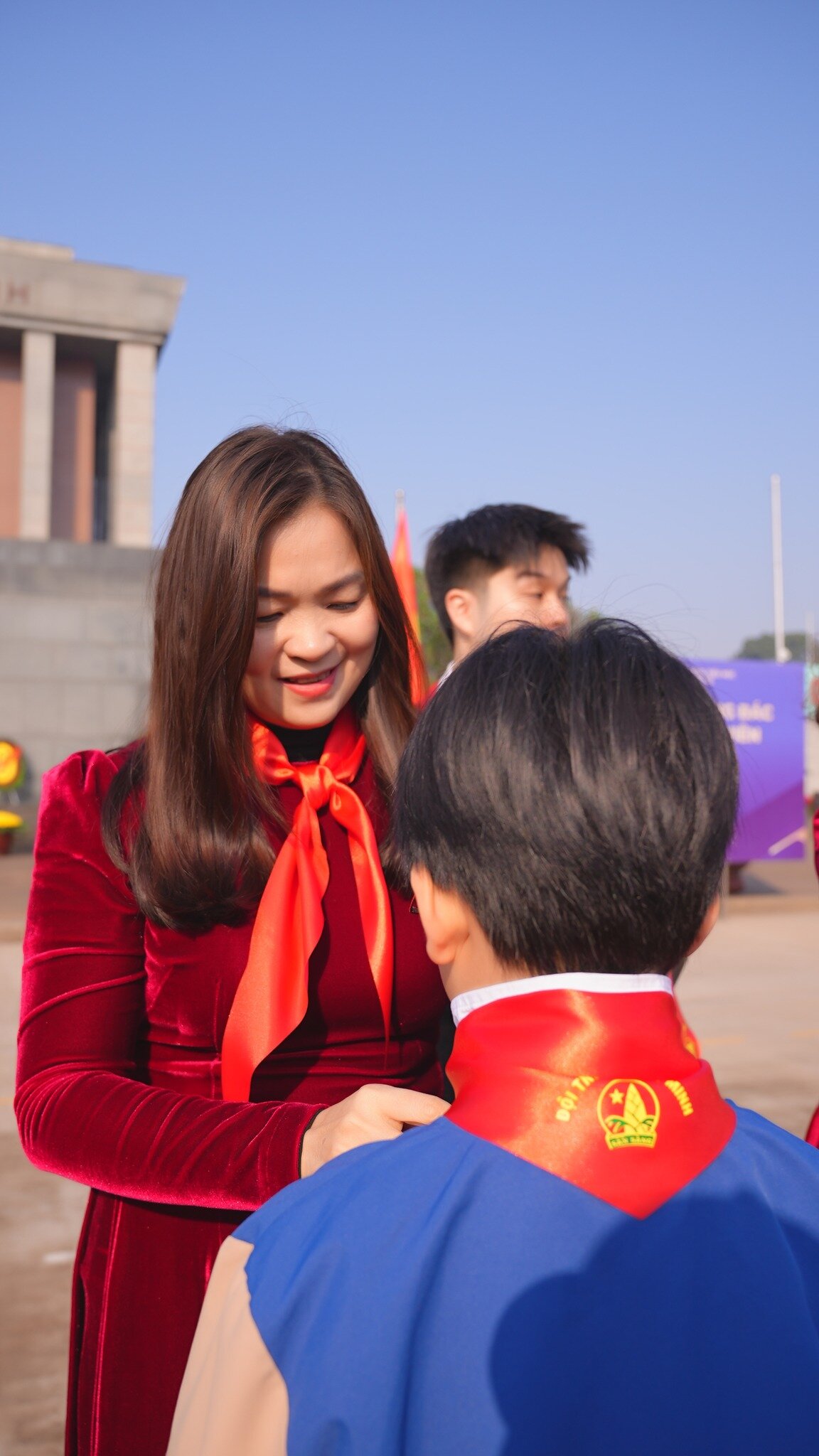 Cô Bùi Hiền, Trợ lý Tổng giám đốc trao khăn quàng đỏ cho các bạn Đội viên