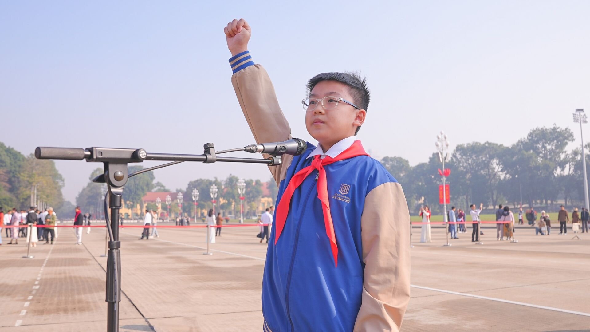 Bạn Đức Bình, học sinh lớp 5Q4 thay mặt 100 bạn đội viên được đứng trong hàng ngũ của Đội TNTP Hồ Chí Minh hứa quyết tâm chăm ngoan, học giỏi, xứng đáng Cháu ngoan Bác Hồ