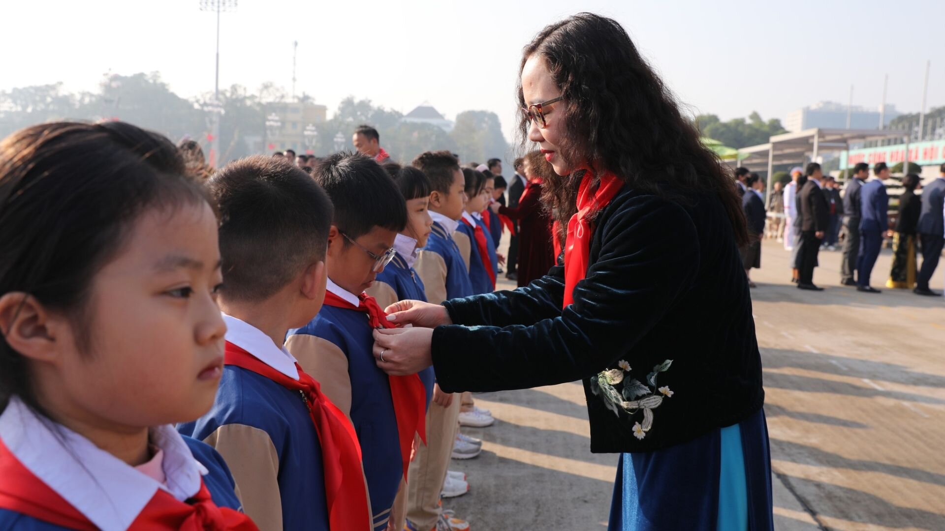 Nhà giáo Huỳnh Thị Hương trao khăn quàng đỏ thắm cho các Đội viên trong dịp kết nạp Đội đặc biệt này